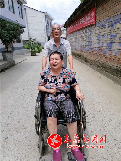 只要遇到好天氣,張業(yè)印就會(huì)用輪椅推著妻子到村部暢亮的大院巴上曬太陽(yáng),或一起到社區(qū)里鄰里之間串個(gè)門(mén),一起聊家常;有時(shí)還會(huì)推著輪椅遠(yuǎn)到陜南民俗村第一村的魯家大院轉(zhuǎn)一轉(zhuǎn),讓妻子始終保持著愉悅的好心情。