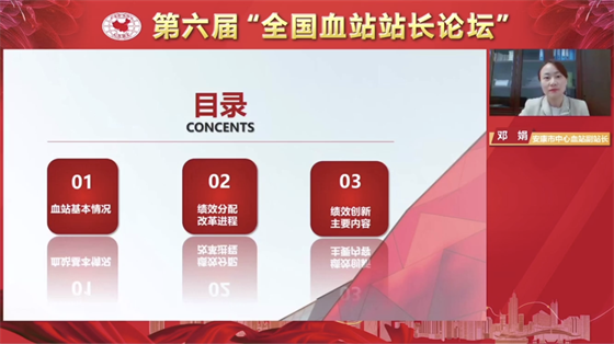 為加強全國血站的經(jīng)驗交流與合作,2021年10月27日至28日,第六屆 “全國血站站長論壇”在深圳市舉辦。中國輸血協(xié)會理事長、世界衛(wèi)生組織輸血合作中心主任朱永明,深圳市衛(wèi)健委二級巡視員林漢城等相關(guān)領(lǐng)導(dǎo)出席并致辭。此次論壇的主題是“血站建設(shè)與發(fā)展、改革與創(chuàng)新”,來自全國各省、市血液中心(血站)的同仁通過線上方式參加會議。安康市中心血站副站長鄧娟作為全國血站六個優(yōu)秀論文交流發(fā)言人之一,就安康血站績效分配、改革與創(chuàng)新工作在會上進行了經(jīng)驗交流。