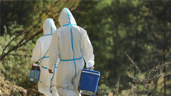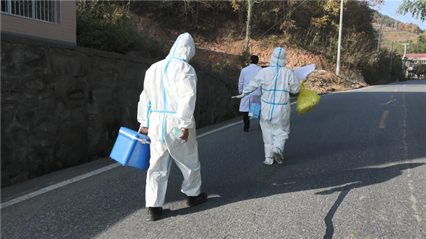 郭莉的腰間系著一個(gè)垃圾回收箱,王康提著防疫箱緊跟其后,捧著采樣管和未拆封的棉簽,一采一消,熟練地完成每一戶隔離群眾的核酸采樣。他們相互配合,收拾好消毒液等用品后,又駕車駛上蜿蜒的山道,馬不停蹄地趕往下一戶隔離群眾家中。