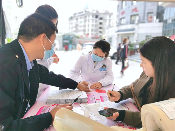 早上9點(diǎn),列隊(duì)等候的醫(yī)務(wù)工作者們?cè)讷I(xiàn)血車前,井然有序的進(jìn)行信息登記、健康征詢、血壓測(cè)量等程序。他們中有多次獻(xiàn)血的“老兵”,也有首次獻(xiàn)血的年輕職工,有的剛下夜班,有的趁工作間隙,還有的則放棄了休息趕來(lái)。大家紛紛表示,無(wú)償獻(xiàn)血就是以實(shí)際行動(dòng)踐行廣大醫(yī)護(hù)人員的初心使命,為老百姓的生命健康保駕護(hù)航。