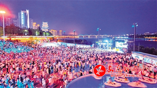 夜幕降臨,酷炫的舞臺(tái)霓虹閃耀、彩燈環(huán)繞、亮如白晝,音樂節(jié)在一曲《別非要我大聲說出來(lái)》中拉開帷幕,可容納千人的親水廣場(chǎng)人聲鼎沸、接踵摩肩,往來(lái)嬉戲游玩、親水樂水、觀看表演的群眾絡(luò)繹不絕。樂隊(duì)貝斯手、吉他手撥動(dòng)琴弦,現(xiàn)場(chǎng)觀眾紛紛揮舞著手中的熒光棒,跟隨音樂盡情搖擺、合唱,隨著《稻香》《簡(jiǎn)單愛》《夢(mèng)醒時(shí)分》等一首首經(jīng)典歌曲的演唱,現(xiàn)場(chǎng)氣氛熱烈、高潮迭起。