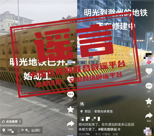真相:近日,網(wǎng)民“張**”“沙**”等發(fā)布視頻,編造并傳播“明光地鐵已開始動(dòng)工”相關(guān)虛假信息,并配以誤導(dǎo)性視頻,引發(fā)關(guān)注和討論。經(jīng)核實(shí),相關(guān)視頻內(nèi)容對應(yīng)區(qū)域施工項(xiàng)目并非修建地鐵,網(wǎng)傳視頻系謠言。明光市委網(wǎng)信辦和市公安局已依法對張某、沙某等進(jìn)行批評教育,并要求其刪除相關(guān)不實(shí)信息。(來源:“安徽省互聯(lián)網(wǎng)違法和不良信息舉報(bào)”微信公眾號、明光市委網(wǎng)信辦)