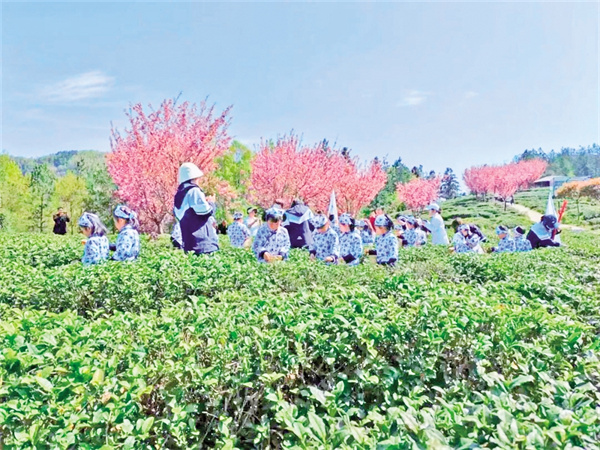 飯后陽(yáng)光漫過(guò)茶壟的剎那,茶園正鋪展著千年的風(fēng)雅。我迫不及待換上采茶圍裙踏入皇茶園,體驗(yàn)采茶、做茶的樂(lè)趣。指尖輕捻“一芽一葉”的嫩綠,在古法炭焙的鐵鍋里翻涌著時(shí)光的溫度,待山泉水與雀舌相遇時(shí),茶香便化作裊裊云煙,在青瓷盞中演繹生命的涅槃。