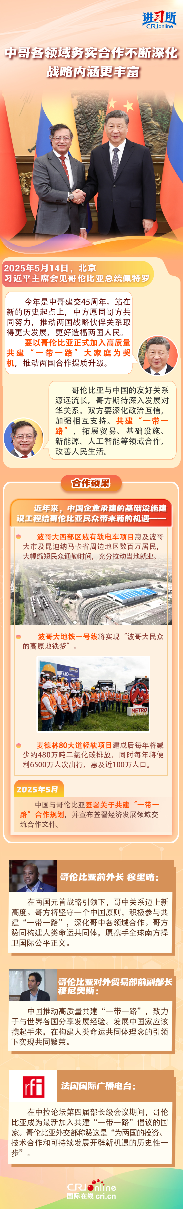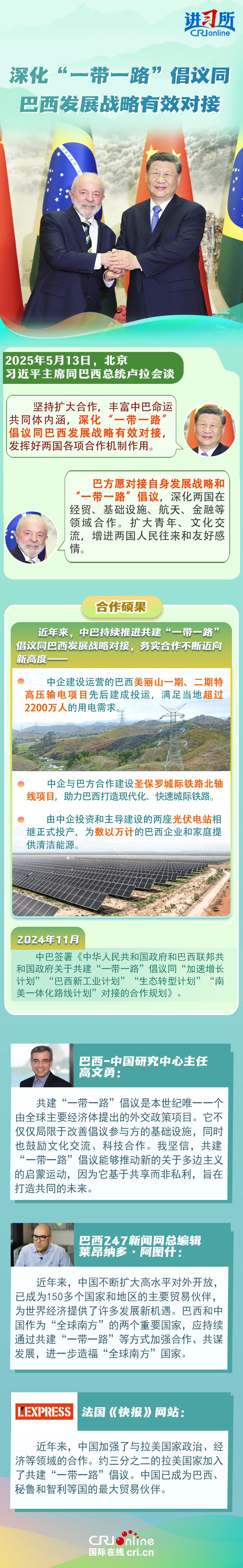 習(xí)近平主席在這三場雙邊外事活動中,均提到了共建“一帶一路”倡議:“深化‘一帶一路’倡議同巴西發(fā)展戰(zhàn)略有效對接”“要以哥倫比亞正式加入高質(zhì)量共建‘一帶一路’大家庭為契機,推動兩國合作提質(zhì)升級”“雙方要落實好共建‘一帶一路’合作規(guī)劃”……10多年來,在習(xí)近平主席親自擘畫和推動下,共建“一帶一路”從中國倡議走向國際實踐,取得了實打?qū)?、沉甸甸的成就?/p>