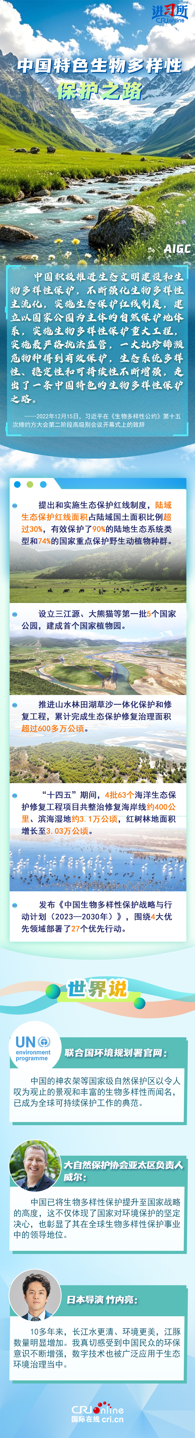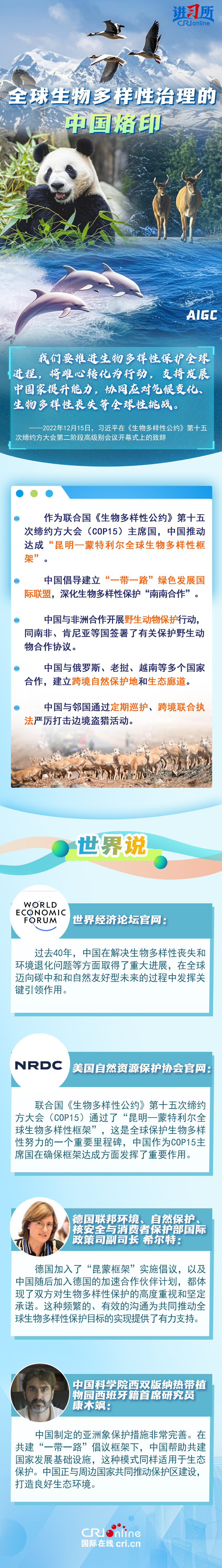 “心往一處想、勁往一處使,共建地球生命共同體。”作為最早簽署、批準《生物多樣性公約》的締約方之一,生物多樣性保護已經(jīng)上升為中國的國家發(fā)展戰(zhàn)略。國際人士表示,中國的一系列舉措體現(xiàn)出對生態(tài)環(huán)境保護的堅定決心,同時,中國依托共建“一帶一路”倡議等國際合作機制,為推動全球生物多樣性保護提供了有力支持,在邁向自然友好型未來的過程中發(fā)揮關鍵的引領作用。
