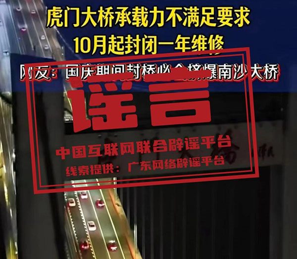 真相:近日,網(wǎng)絡(luò)上流傳“虎門大橋10月起封閉維修”的消息。經(jīng)東莞日?qǐng)?bào)記者核實(shí),該信息不準(zhǔn)確?;㈤T大橋在國(guó)慶假期期間將正常通行且繼續(xù)實(shí)行免費(fèi)政策。9月29日,廣東虎門大橋有限公司明確表示:虎門大橋在2026年春節(jié)前不會(huì)采取全封或半封措施,具體封閉時(shí)間及方案,目前均未確定。據(jù)悉,此前東莞市發(fā)展和改革局曾發(fā)布過(guò)相關(guān)評(píng)估前的公示,其中提到預(yù)計(jì)開(kāi)工時(shí)間,但并非實(shí)際施工時(shí)間。(來(lái)源:“廣東省互聯(lián)網(wǎng)舉報(bào)中心”微信公眾號(hào)、東莞日?qǐng)?bào))