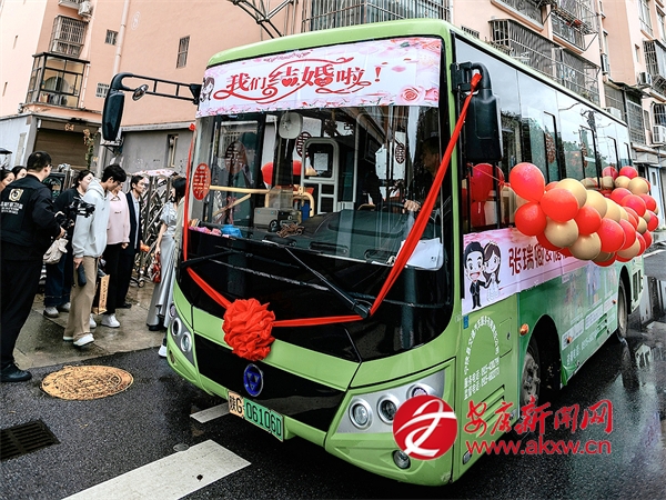 為了讓公交車(chē)更有“婚禮氛圍”,新郎、新娘和親友們一起用氣球、飾品和貼畫(huà)對(duì)車(chē)廂進(jìn)行了簡(jiǎn)單裝飾,既溫馨又不浮夸。10月4日迎親當(dāng)天,精心裝飾的婚車(chē)準(zhǔn)時(shí)到達(dá)目的地。橫幅海報(bào)“我們結(jié)婚啦”與紅繡球貼在公交車(chē)頭,氣球貼滿車(chē)身,將接親的儀式感“拉滿”。新郎、新娘在眾多親朋好友的陪伴下,一起登上這輛“專(zhuān)車(chē)”,駛向名為“幸?!钡南乱徽尽\?chē)廂內(nèi),互動(dòng)節(jié)目層出不窮,祝福歌聲不斷,一路歡聲笑語(yǔ)。車(chē)窗外,不少市民看到這獨(dú)特的“婚車(chē)”,紛紛拿出手機(jī)拍照,揮手送上祝福。