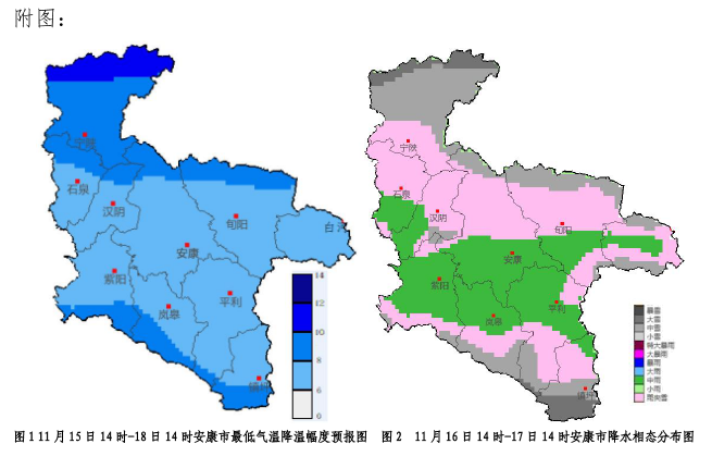 受冷空氣影響,15—17日全市過程日最低氣溫下降8~10℃,最低氣溫將出現(xiàn)在18日和19日清晨,全市大部會出現(xiàn)今冬初霜凍。預(yù)計最低氣溫:川道地區(qū)-4~2℃,中高山地區(qū)-8~-4℃,秦巴高山局地低于-8℃。16日夜間至17日白天我市大部有明顯吹風(fēng)天氣,陣風(fēng)可達(dá)5—6級。