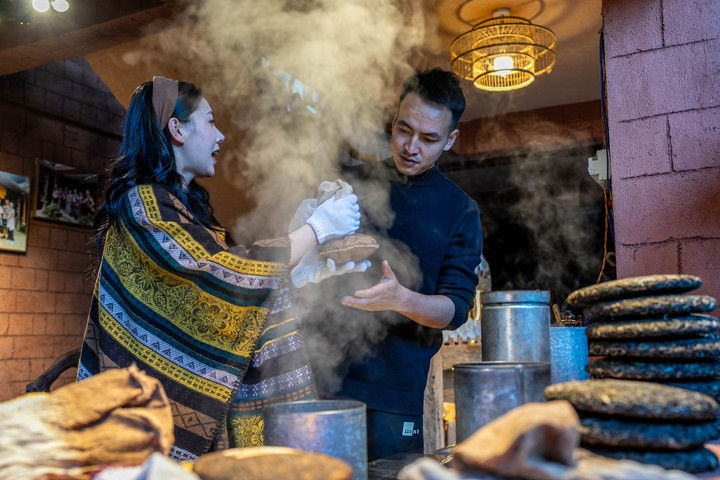 2024年4月13日,一名俄羅斯塔斯社記者(右)在大理市體驗包裝下關沱茶。據(jù)統(tǒng)計,2025年1月至6月,云南省接待入境過夜游客251.03萬人次,同比增長86%。