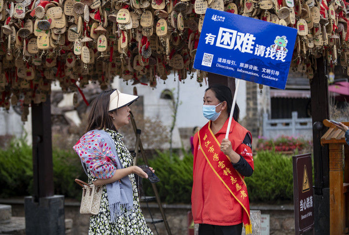 2023年5月18日,一名游客(左)在麗江古城向志愿者咨詢。2015年12月,云南麗江古城保護管理局牽頭成立了麗江古城旅游志愿者服務隊,志愿者主要來自市區(qū)機關單位、古城保護管理局、古城經(jīng)營戶、在校學生、社區(qū)居民等,常年在古城內(nèi)提供旅游咨詢、道路指引、文明引導等志愿服務。