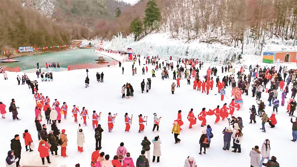 元旦期間,平利縣以“冬賞雪·趣平利”為主題,創(chuàng)新推出冰雪文旅融合系列活動,打造集觀賞、體驗、美食于一體的冰雪樂園。圖為1月2日,游客在平利縣八仙鎮(zhèn)天書峽景區(qū)游玩。 沈奕君 攝