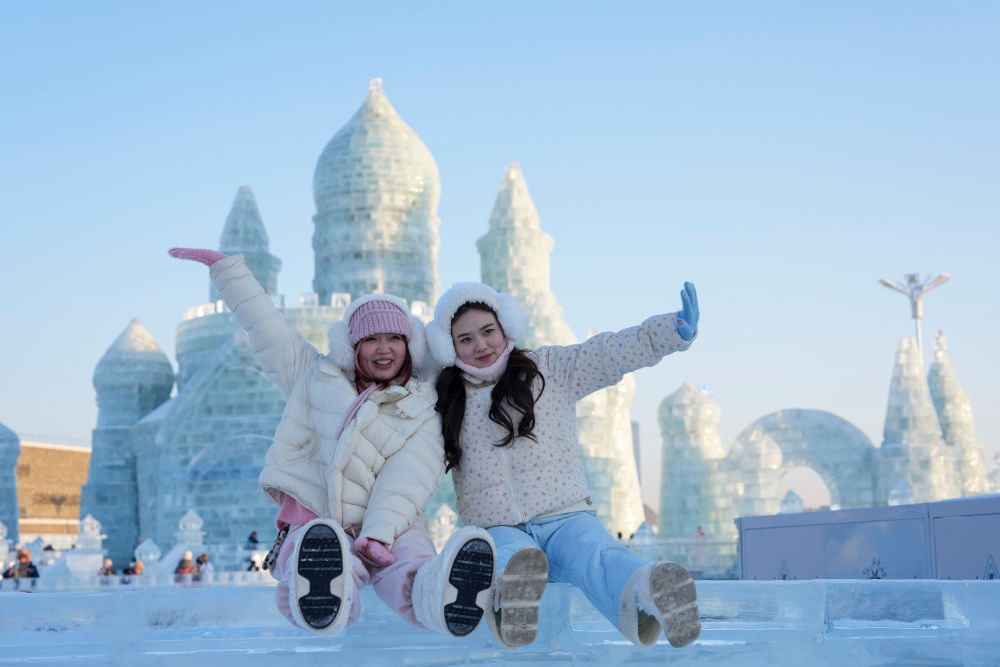 在哈爾濱冰雪大世界,來(lái)自世界各地的游客在“冰雪王國(guó)”感受冬日限定快樂(lè)。