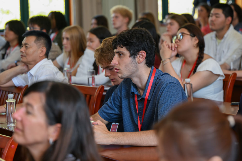 2025年7月28日,在湖北省黃岡市紅安縣,美國飛虎隊(duì)夏令營代表團(tuán)成員觀看紀(jì)錄片《飛虎情緣》。新華社記者 杜子璇 攝