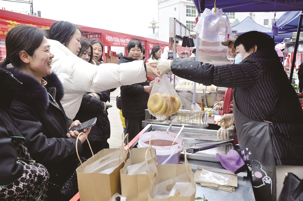 節(jié)日里的紫陽(yáng)縣城一派繁榮祥和,圖為市民在頗有名氣的煥古高老二的油糍攤前排隊(duì)購(gòu)買。彭召伍 攝