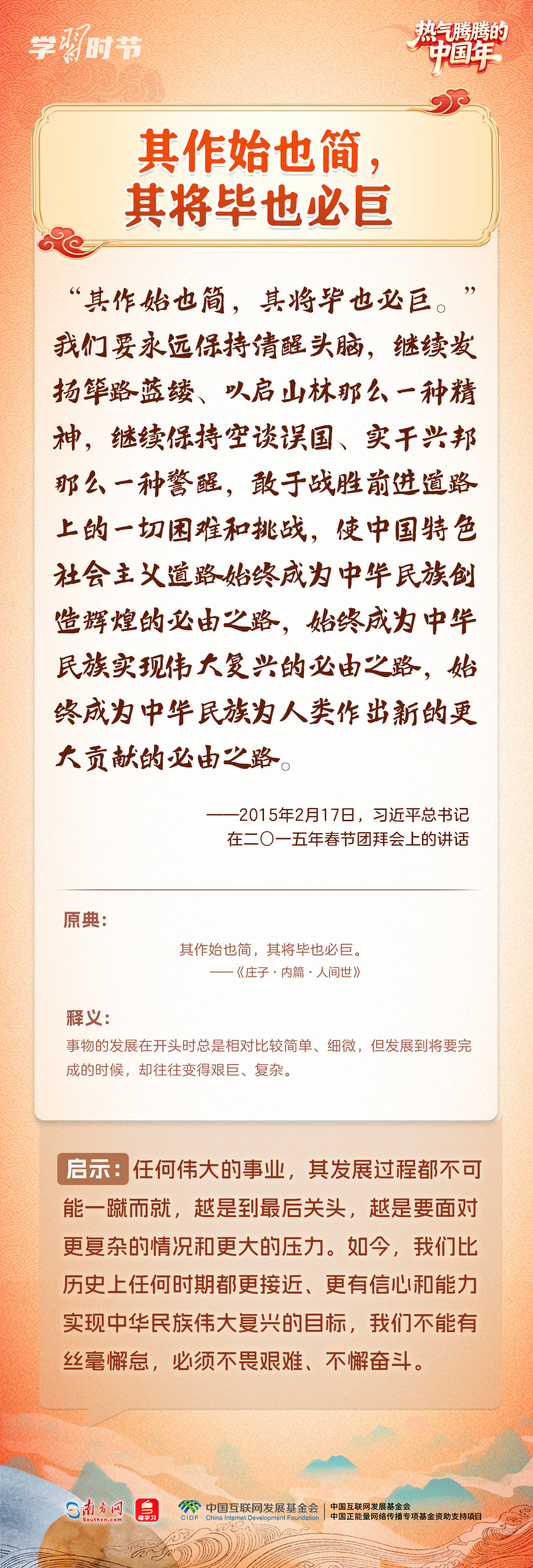 “在中國(guó)式現(xiàn)代化新征程上策馬揚(yáng)鞭、勇往直前,共同開創(chuàng)更加美好的未來(lái)?!?月14日,在二〇二六年春節(jié)團(tuán)拜會(huì)上,習(xí)近平總書記的重要講話振奮人心。黨的十八大以來(lái),習(xí)近平總書記多次在春節(jié)團(tuán)拜會(huì)上發(fā)表重要講話,回望舊歲、展望新年,向大家致以美好的新春祝福。在講話中,習(xí)近平總書記常常巧妙引用古典名句砥礪人心,指引我們腳踏實(shí)地、銳意前行,提醒我們珍視親情、涵養(yǎng)孝道。一起來(lái)學(xué)習(xí)感悟。