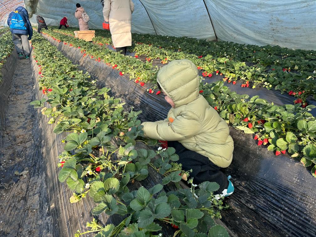 2026年1月22日,在河南洛陽孟津區(qū)送莊鎮(zhèn)十里香現(xiàn)代農(nóng)業(yè)觀光園,前來研學的孩子們體驗采摘草莓的樂趣。(受訪者供圖)