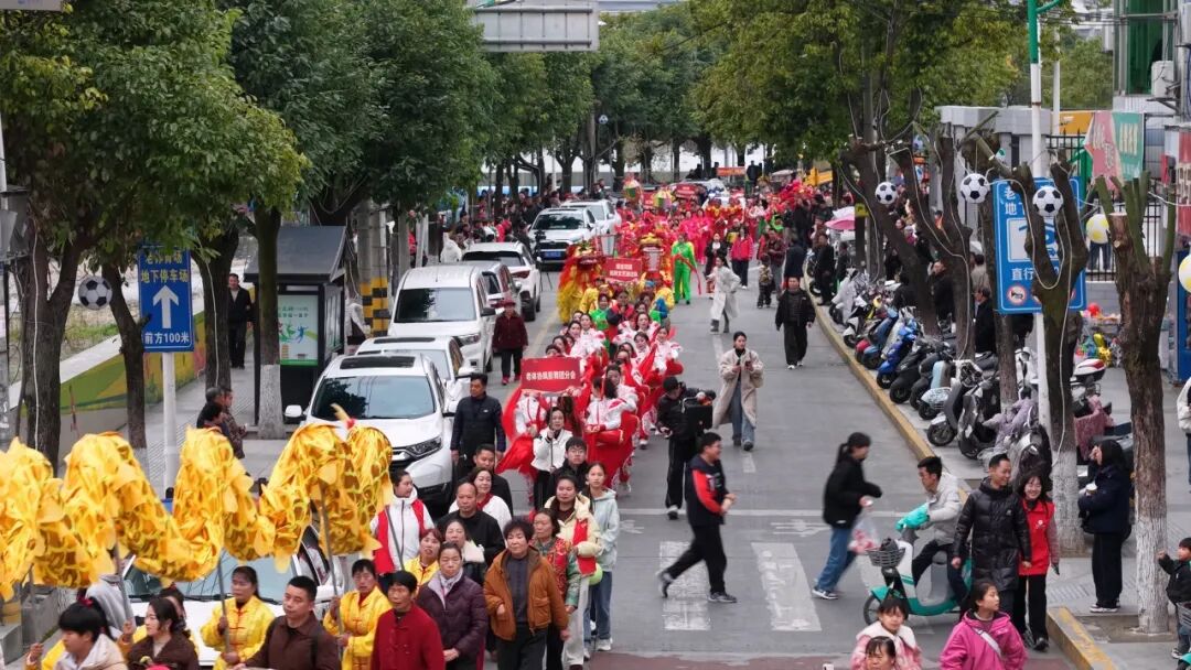 在主會場定點展演環(huán)節(jié),各支隊伍各顯神通。率先登場的威風鑼鼓隊由老中青三代村民組成,整齊劃一的動作、雄渾震撼的節(jié)奏,敲出了鄉(xiāng)村振興的精氣神。彩獅隊則展現(xiàn)了半個多世紀的傳承堅守,這支成立于1972年的隊伍,隊員年齡跨度橫跨四代,紅綢舞動間,雄獅騰躍翻滾,贏得陣陣叫好。