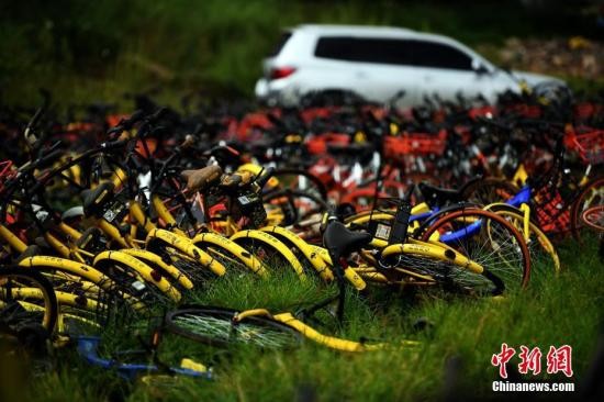 9月9日,現(xiàn)場(chǎng)堆積如山的共享單車(chē)。中新社記者 李進(jìn)紅 攝