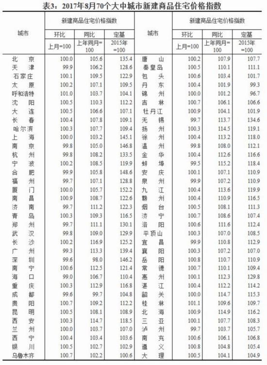 2017年8月70個大中城市新建商品住宅價格指數(shù)。來源:國家統(tǒng)計局