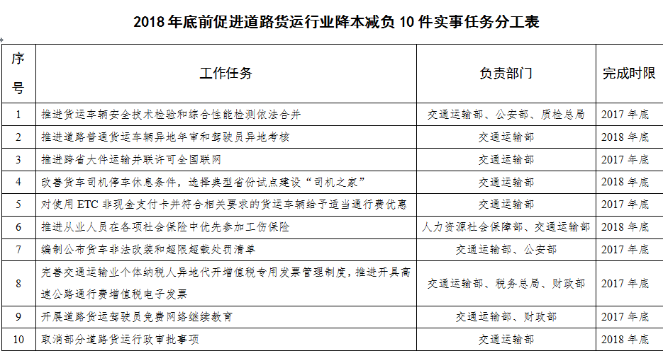 2018年底前,完成降本減負(fù)10件實(shí)事(見附件),推動(dòng)政策落地并取得實(shí)質(zhì)性進(jìn)展。制度性交易成本大幅降低,貨車司機(jī)生產(chǎn)生活條件顯著改善,貨運(yùn)業(yè)戶的獲得感和貨車司機(jī)的歸屬感持續(xù)增強(qiáng),行業(yè)平穩(wěn)發(fā)展的基礎(chǔ)更加牢固。