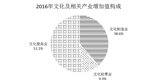 按行業(yè)分,2016年文化制造業(yè)增加值為11889億元,比上年增長7.6%,占文化及相關產(chǎn)業(yè)增加值的比重為38.6%;文化批發(fā)零售業(yè)增加值為2872億元,增長13.0%,占9.3%;文化服務業(yè)增加值為16024億元,增長17.5%,占52.1%。