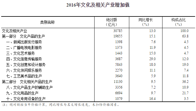 數(shù)據(jù)顯示,根據(jù)《文化及相關產(chǎn)業(yè)分類(2012)》和《文化及相關產(chǎn)業(yè)增加值核算方法》的規(guī)定和要求,經(jīng)核算,2016年全國文化及相關產(chǎn)業(yè)增加值為30785億元,比上年增長13.0%(未扣除價格因素,下同),比同期GDP名義增速高4.4個百分點;占GDP的比重為4.14%,比上年提高0.17個百分點。2016年文化及相關產(chǎn)業(yè)保持平穩(wěn)快速增長,比重穩(wěn)步上升,對促進經(jīng)濟轉型升級、平穩(wěn)健康可持續(xù)發(fā)展發(fā)揮了重要作用。