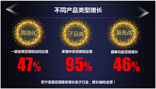 蘇寧易購大數(shù)據(jù)平臺(tái)顯示,產(chǎn)品結(jié)構(gòu)變化的方向有三:一、高端化趨勢如一級(jí)變頻空調(diào)銷量同比增47%;其二、以家用中央空調(diào)為代表的子品類銷量增長95%;其三、功能趨勢最大亮點(diǎn),健康功能空調(diào)增長46%。t8g安康新聞網(wǎng)