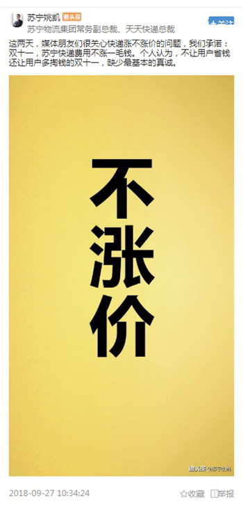 面對快遞公司的紛紛漲價,不少剁手黨們擔心,最后的成本都會出在自己身上。針對這一熱點話題,9月27日,蘇寧物流常務副總裁姚凱通過微頭條發(fā)聲,承諾這個雙十一,蘇寧快遞費用不漲一毛錢!他認為,不為用戶省錢還讓用戶多掏錢的雙十一,缺少最基本的真誠。