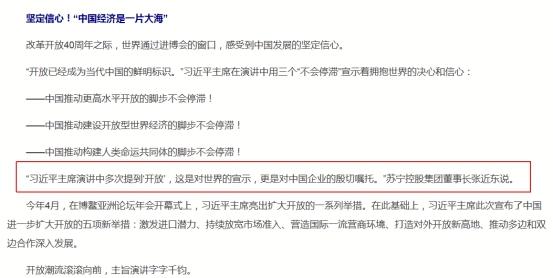 張近東在接受《經(jīng)濟(jì)日?qǐng)?bào)》采訪時(shí)表示,這番講話就是在給中國和世界帶來機(jī)遇和信心,更令中國企業(yè)家們干勁十足。未來蘇寧將在全球采購百億歐元的商品和服務(wù),因?yàn)橹袊鴻C(jī)遇是平等向所有人敞開的,具備世界品格的蘇寧會(huì)持續(xù)鍛造智能零售平臺(tái),初心始終,就能傲立潮頭。