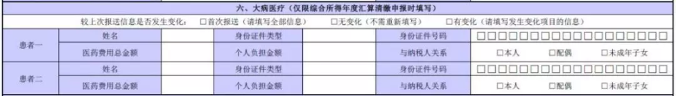 大病醫(yī)療一欄中,“醫(yī)藥費(fèi)用總金額”需填寫社會(huì)醫(yī)療保險(xiǎn)管理信息系統(tǒng)記錄的與基本醫(yī)保相關(guān)的醫(yī)藥費(fèi)用總金額;個(gè)人負(fù)擔(dān)金額需填寫社會(huì)醫(yī)療保險(xiǎn)管理信息系統(tǒng)記錄的基本醫(yī)保目錄范圍內(nèi)扣除醫(yī)保報(bào)銷后的個(gè)人自付部分。