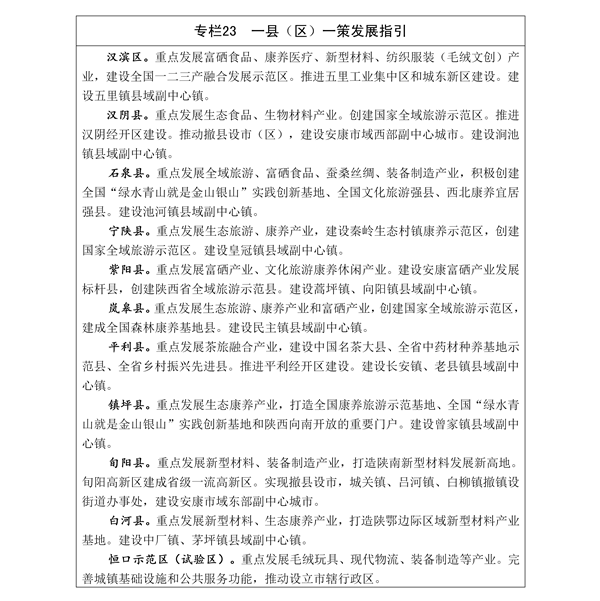 構(gòu)建“一核、兩心、兩帶、多點(diǎn)”新型城鎮(zhèn)化格局。一核:以中心城市為核心,推動(dòng)瀛湖生態(tài)旅游區(qū)、恒口示范區(qū)(試驗(yàn)區(qū))融入中心城市發(fā)展。兩心:推進(jìn)漢陰、旬陽(yáng)市域副中心城市建設(shè)。兩帶:月河川道城鎮(zhèn)帶,統(tǒng)籌中心城市—恒口—漢陰—石泉協(xié)同發(fā)展,建設(shè)城鄉(xiāng)統(tǒng)籌示范區(qū)、新型工業(yè)聚集區(qū)、綠色發(fā)展引領(lǐng)區(qū)。漢江生態(tài)城鎮(zhèn)帶,以漢濱、石泉、旬陽(yáng)為核心,漢陰、紫陽(yáng)、嵐皋、白河為節(jié)點(diǎn),輻射帶動(dòng)其他區(qū)域,打造三產(chǎn)融合發(fā)展的漢江生態(tài)城鎮(zhèn)帶。多點(diǎn):以其他縣城、重點(diǎn)鎮(zhèn)、縣域工業(yè)集中區(qū)、現(xiàn)代農(nóng)業(yè)園區(qū)和旅游景區(qū)為節(jié)點(diǎn),打造縣域經(jīng)濟(jì)增長(zhǎng)極。
