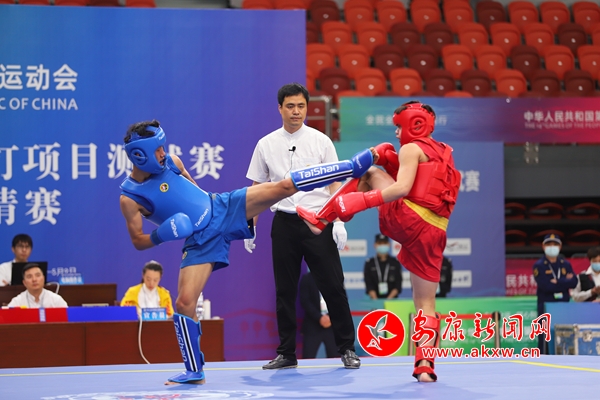 “開始!”隨著裁判員口令,紅藍(lán)雙方運(yùn)動員立即展開了激烈的爭奪,賽場上他們毫無畏懼,拳法剛勁兇猛,腿法雷霆萬鈞,摔法干脆利落。“拳腿結(jié)合”“主動點(diǎn)”場下教練不時提醒。觀眾席不斷響起熱烈的掌聲。