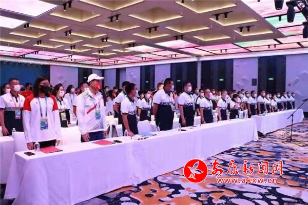 會議在莊嚴(yán)的國歌聲中開始,全體運動員、教練員、技術(shù)官員身著隊服,肅立齊唱國歌。