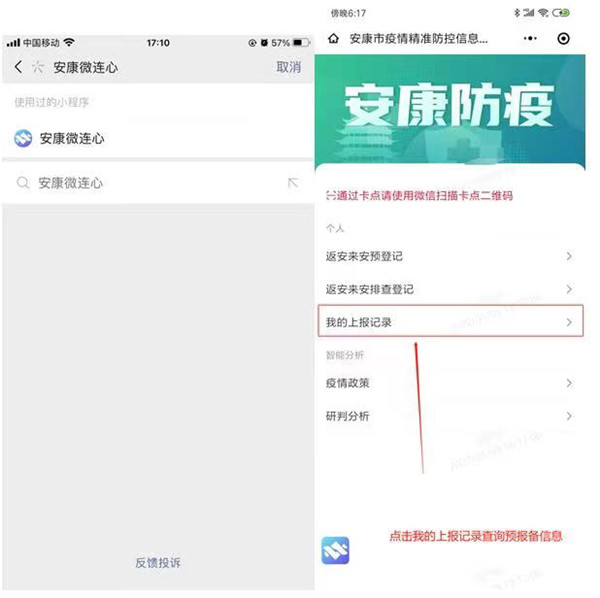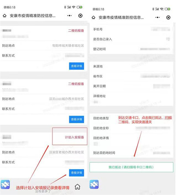 第三步,通過交通卡口,打開“安康微連心”微信小程序,點擊“安康防疫”,進入“我的上報記錄”,點擊“查看詳情”,點擊“我已抵達” 并掃描交通卡口“返安排查登記二維碼”確認抵達。