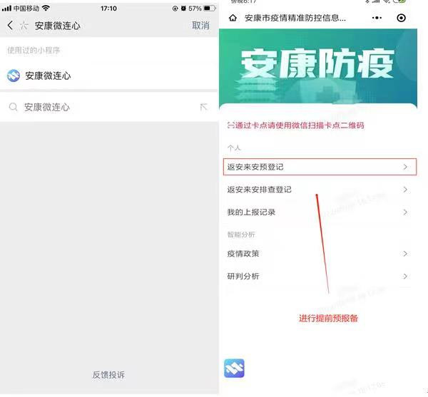 第一步,打開微信,搜索“安康微連心”小程序(首次登記需先實名認證),點擊“安康防疫”,點擊“返安來安預(yù)登記”。