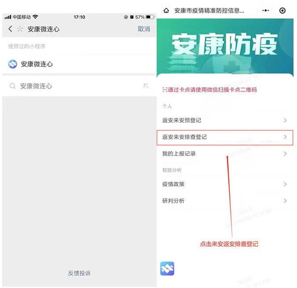 第一步,打開微信,搜索“安康微連心”小程序(首次登記需先實名認證),點擊“安康防疫”,點擊“返安來安排查登記”。