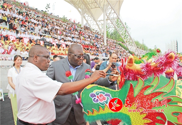 2016年,第十六屆安康龍舟節(jié)開(kāi)幕式上,外國(guó)友人為龍頭點(diǎn)睛。 張喬 攝