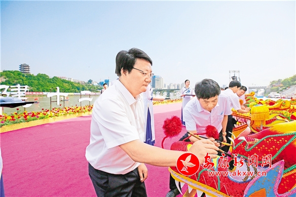 2021年,第二十一屆安康龍舟節(jié)開幕式上,嘉賓為龍頭點睛。 潘潤生 攝BDi安康新聞網(wǎng)
