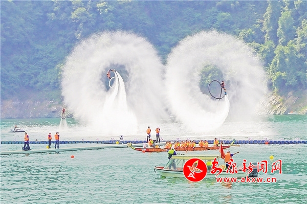 2019年,第十九屆安康龍舟節(jié)系列活動之瀛湖翠屏島水上表演。汪德珍 攝BDi安康新聞網(wǎng)
