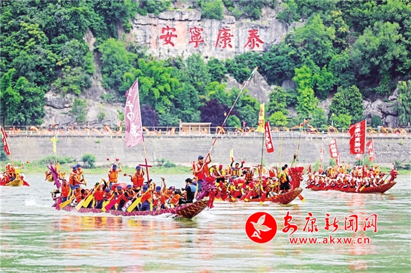 6月22日,第二十三屆中國(guó)安康漢江龍舟節(jié)開幕,28支參賽隊(duì)伍在漢江上表演龍舟競(jìng)渡,喜迎端午佳節(jié)。 張昊 攝
