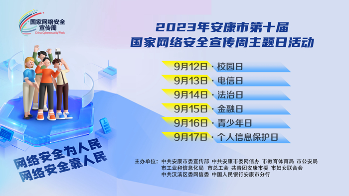 本網(wǎng)訊(記者 趙漪湉)2023年安康市第十屆國家網(wǎng)絡(luò)安全宣傳周將于9月11日至17日在全市范圍內(nèi)統(tǒng)一開展。開幕式、網(wǎng)絡(luò)安全科技成果展、網(wǎng)絡(luò)安全技能競賽、網(wǎng)絡(luò)安全大講堂、“六大主題日”活動等重要活動將輪番舉行。今年網(wǎng)安周繼續(xù)以“網(wǎng)絡(luò)安全為人民,網(wǎng)絡(luò)安全靠人民”為主題,通過展覽、競賽、講堂等形式,實現(xiàn)每一主題日都有主題、有活動,全面營造全社會共筑網(wǎng)絡(luò)安全防線濃厚氛圍。我市網(wǎng)安周期間,有哪些精彩活動可以參與?