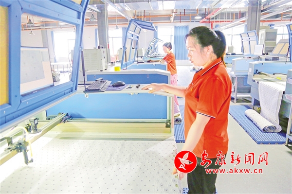工人們正在操作激光機對毛絨玩具外形布料進行切割。