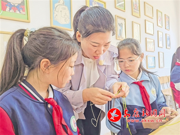 倉上鎮(zhèn)中心小學(xué)編織社團(tuán)老師在教授編織技巧