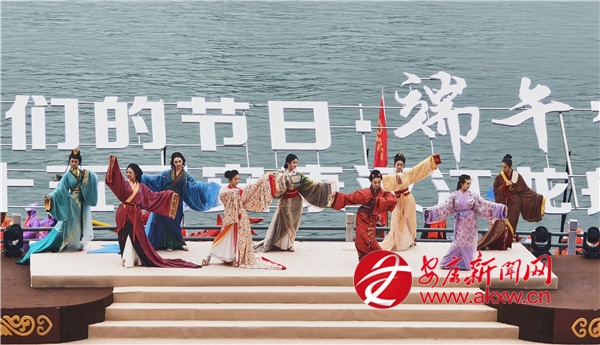 活動現(xiàn)場,6聲渾厚鐘聲劃破長空。“緬懷先賢……”隨著主祭官畫外音傳來,60名身著青綠漢服的女子手捧香粽菖蒲,踏古琴清音翩躚而出。屈原塑像被緩緩護(hù)送入舞臺中央,112名身著漢服的學(xué)童齊聲詠頌祭文的聲浪在江岸回蕩。隨著粽拋碧波,香囊、梔子花贈客,流淌千年的龍舟文化,化作平安順利、幸福安康的當(dāng)代回響。