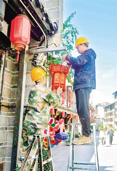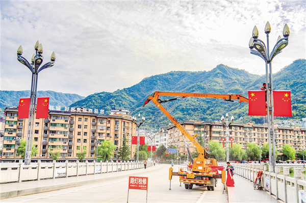 9月24日,石泉縣積極籌備國慶黃金周旅游服務(wù)保障工作。圖為石泉縣漢江古城景區(qū),工作人員正在更換景觀燈。 譚文昌 攝hdS安康新聞網(wǎng)