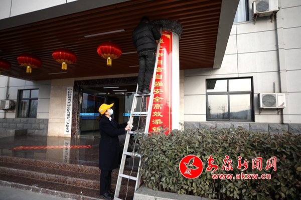 Wfj安康新聞網(wǎng) 圖為該站干部職工在機(jī)關(guān)樓下貼春聯(lián)Wfj安康新聞網(wǎng)