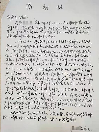 一封信,緊連著警民間的情誼;一頁(yè)信紙,書寫著群眾發(fā)自肺腑的感謝。“感謝貴局培養(yǎng)出的好警察,感謝他們愛民為民的情懷和積極擔(dān)當(dāng)?shù)淖黠L(fēng)……”近日,安康市公安局收到一封來(lái)自山東省滕州市濱湖鎮(zhèn)屈先生一家的手寫感謝信,字里行間滿是對(duì)安康市公安局漢濱分局西城派出所副所長(zhǎng)胡龍及其同事許文波心系群眾、履職盡責(zé)、為民解憂的感激之情和贊許之意。