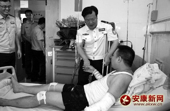 安康市公安局局長(zhǎng)看望王曉勇 本報(bào)記者吳琛攝 “為抓捕犯罪嫌疑人,他被拖行100余米,全身多處擦傷,警察兄弟辛苦了!”、“用你的傷痛,換來(lái)……