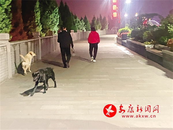 4月5日晚,安康城區(qū)城堤上有市民遛狗不牽繩。胡波 攝……