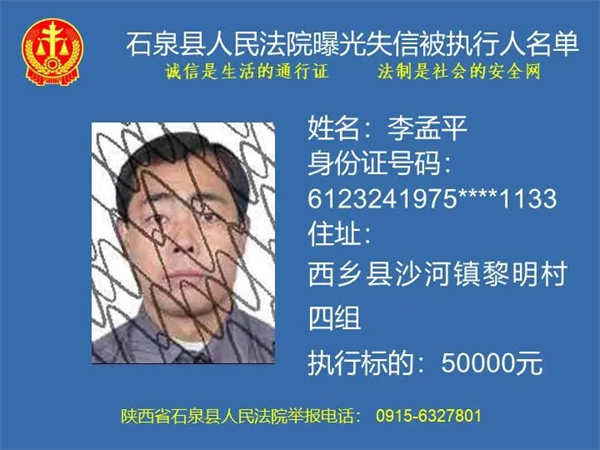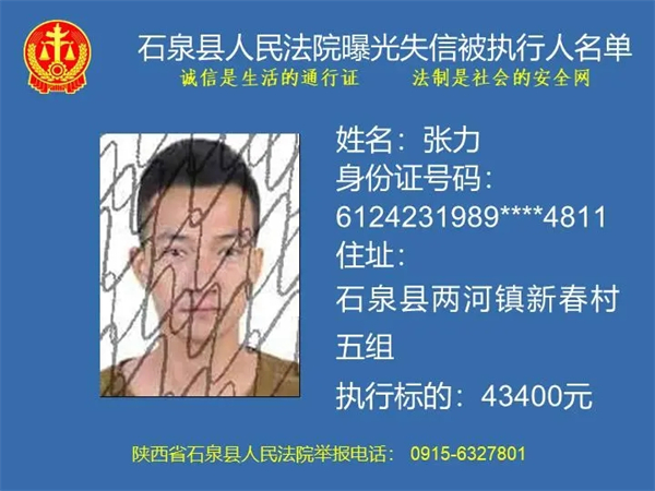 為了進(jìn)一步加大執(zhí)行力度,保障勝訴當(dāng)事人的合法權(quán)益,推進(jìn)社會(huì)誠信體系建設(shè),依照《中華人民共和國民事訴訟法》《最高人民法院關(guān)于公布失信被執(zhí)行人名單信息的若干規(guī)定》等法律、司法解釋的有關(guān)規(guī)定,現(xiàn)對(duì)一批已進(jìn)入執(zhí)行程序,且尚未全部履行義務(wù)的被執(zhí)行人進(jìn)行媒體曝光,歡迎廣大群眾支持石泉縣人民法院的工作,向我院提供被執(zhí)行人的財(cái)產(chǎn)線索,使生效法律文書能夠得到切實(shí)執(zhí)行,讓人民群眾切實(shí)感受到公平正義就在身邊。K8b安康新聞網(wǎng)